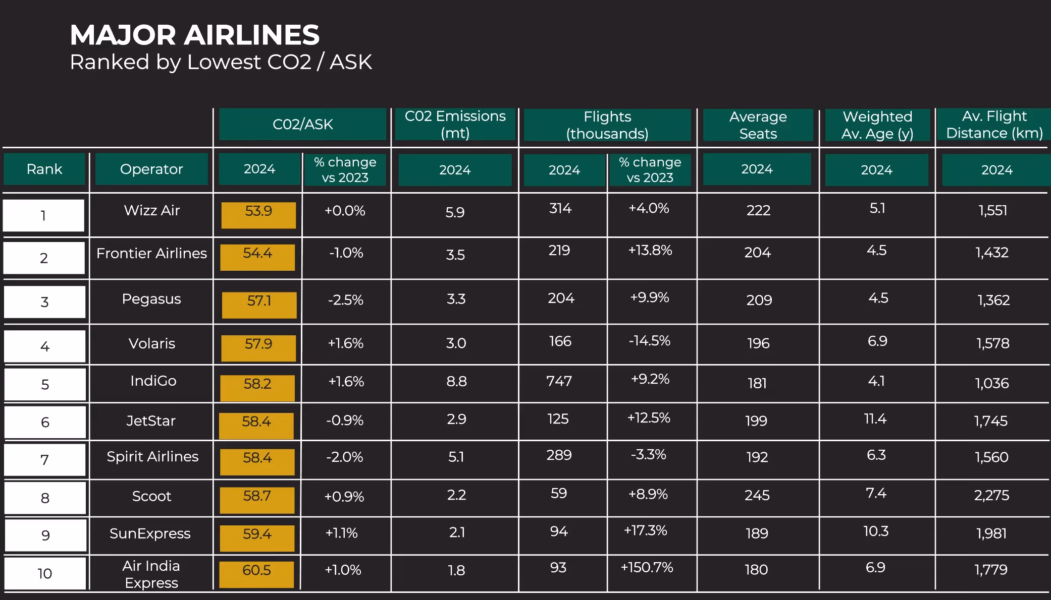 - Wizz Air (53.9g CO₂ per ASK)
