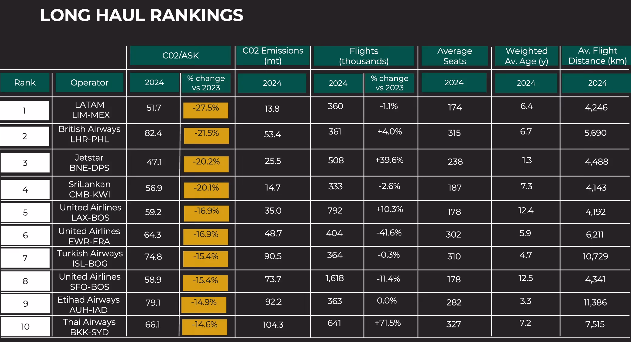 One of the most striking aspects of the review is its analysis of specific long-haul routes that achieved the most significant year-over-year reductions in CO₂ emissions.