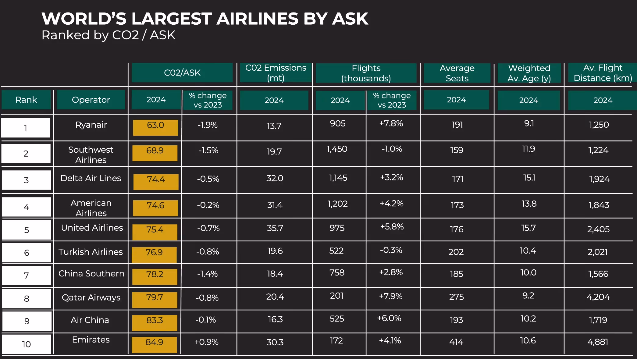 Wizz Air, for example, increased flights by 4% while holding emissions per ASK flat, demonstrating the impact of newer, high-density fleets. The airline’s average aircraft age is just over five years.