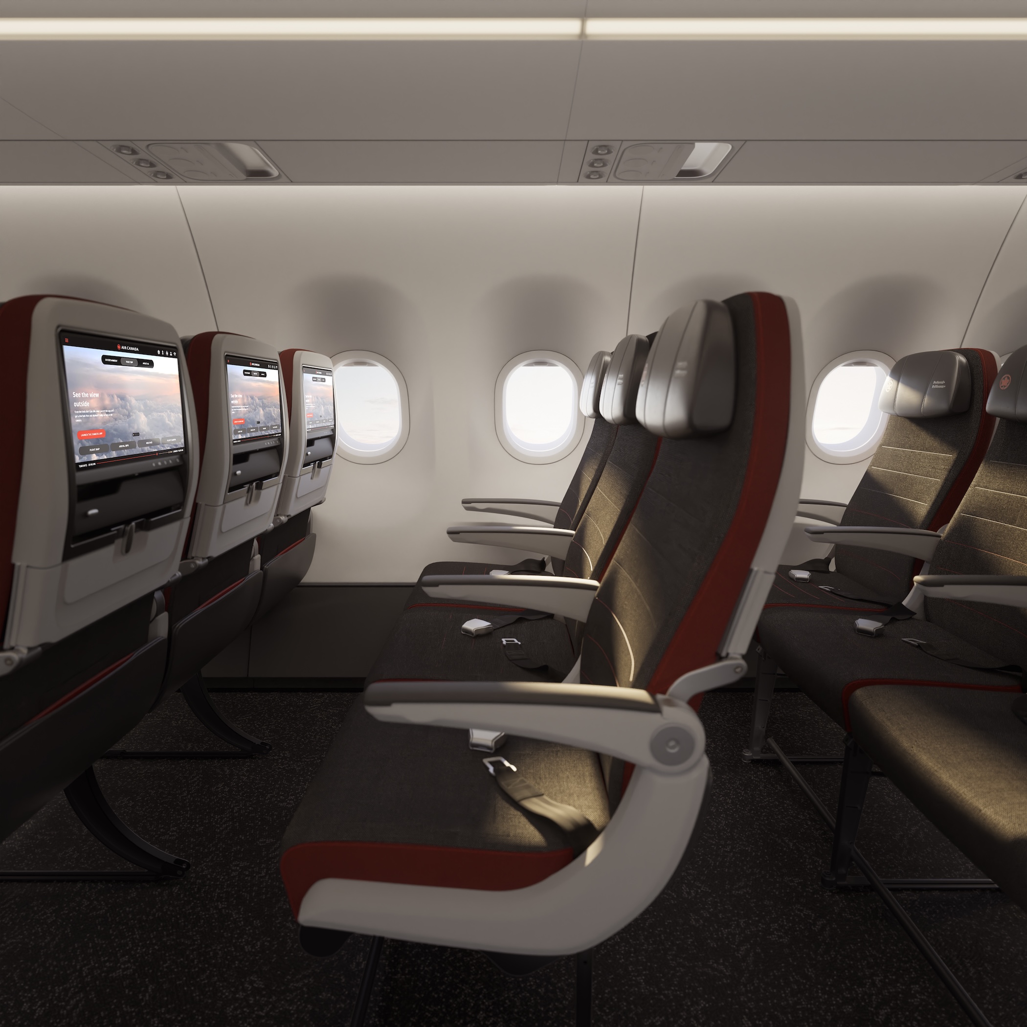 - Air Canada Signature red stitching and bespoke fabrics provide a subtle Canadian touch paired with a palette of greys and stone.