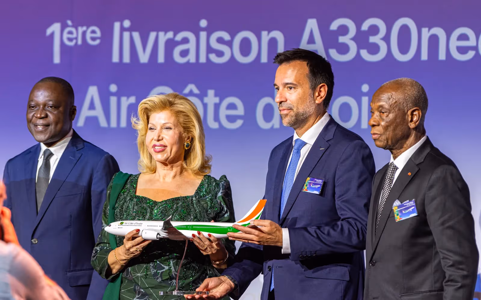 From Airbus, Gabriel Sémelas, President of Airbus in Africa and the Middle East, Board of Directors of Air Côte d'Ivoire, General Abdoulaye Coulibaly, Amadou Koné, Minister of Transport from Côte d’Ivoire, and Dominique Ouattara, First Lady of Côte d’Ivoire.