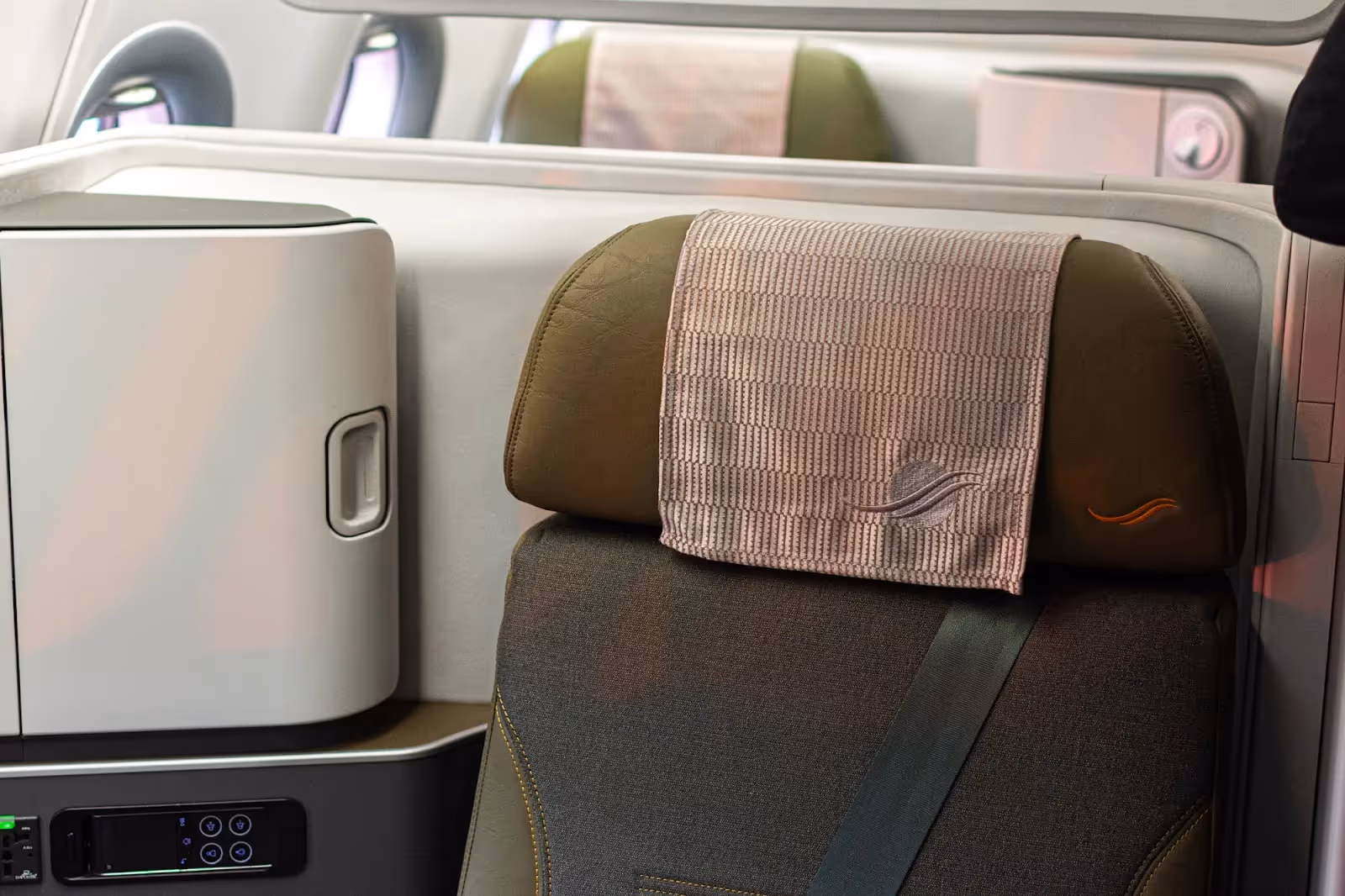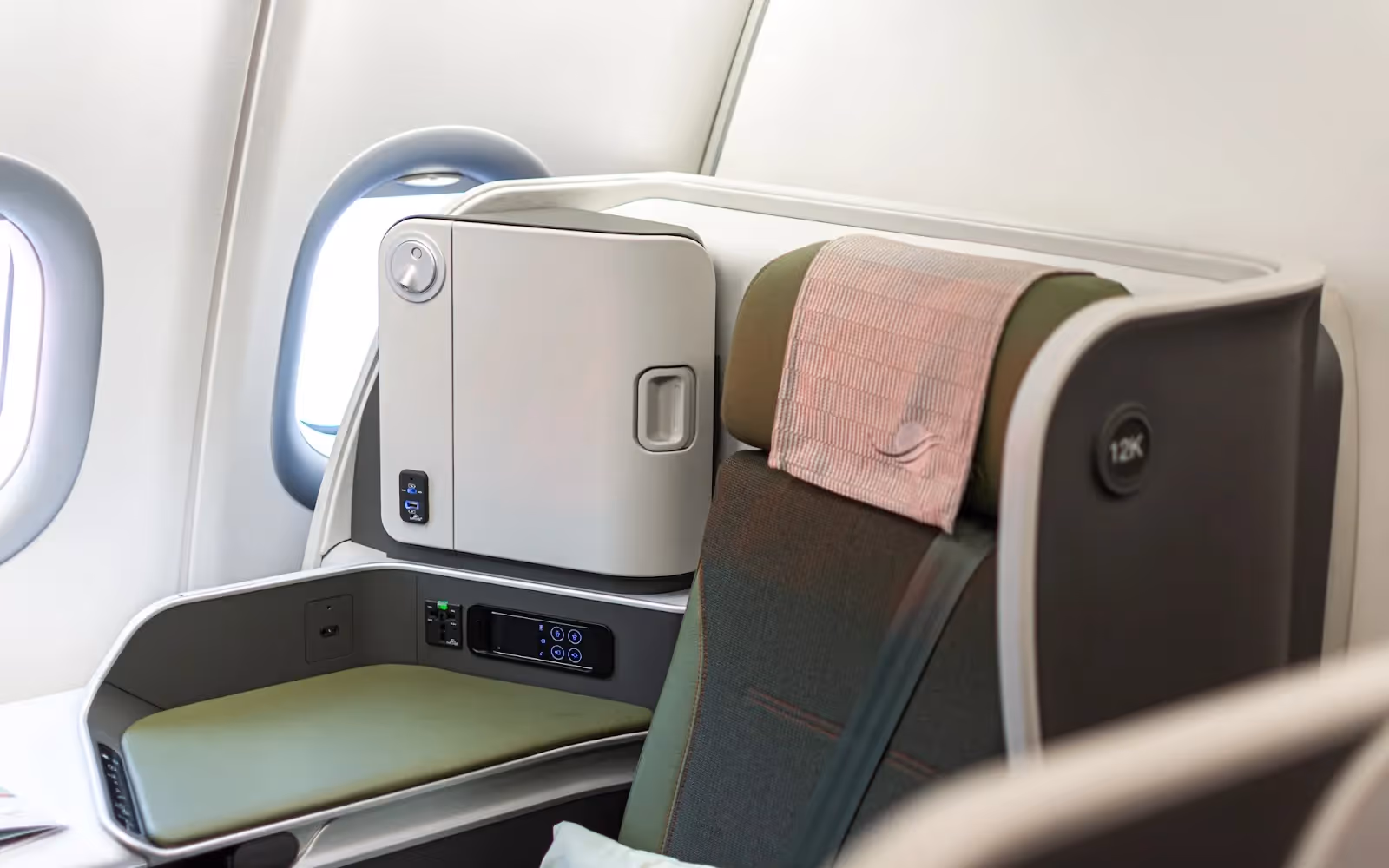 Behind, 44 business class seats also made by Thomson, offer all direct aisle access in a staggered 1-2-1 configuration. Similar to first class, we can find large 4K screens, multiple modern power outlets, and a lie-flat capability.