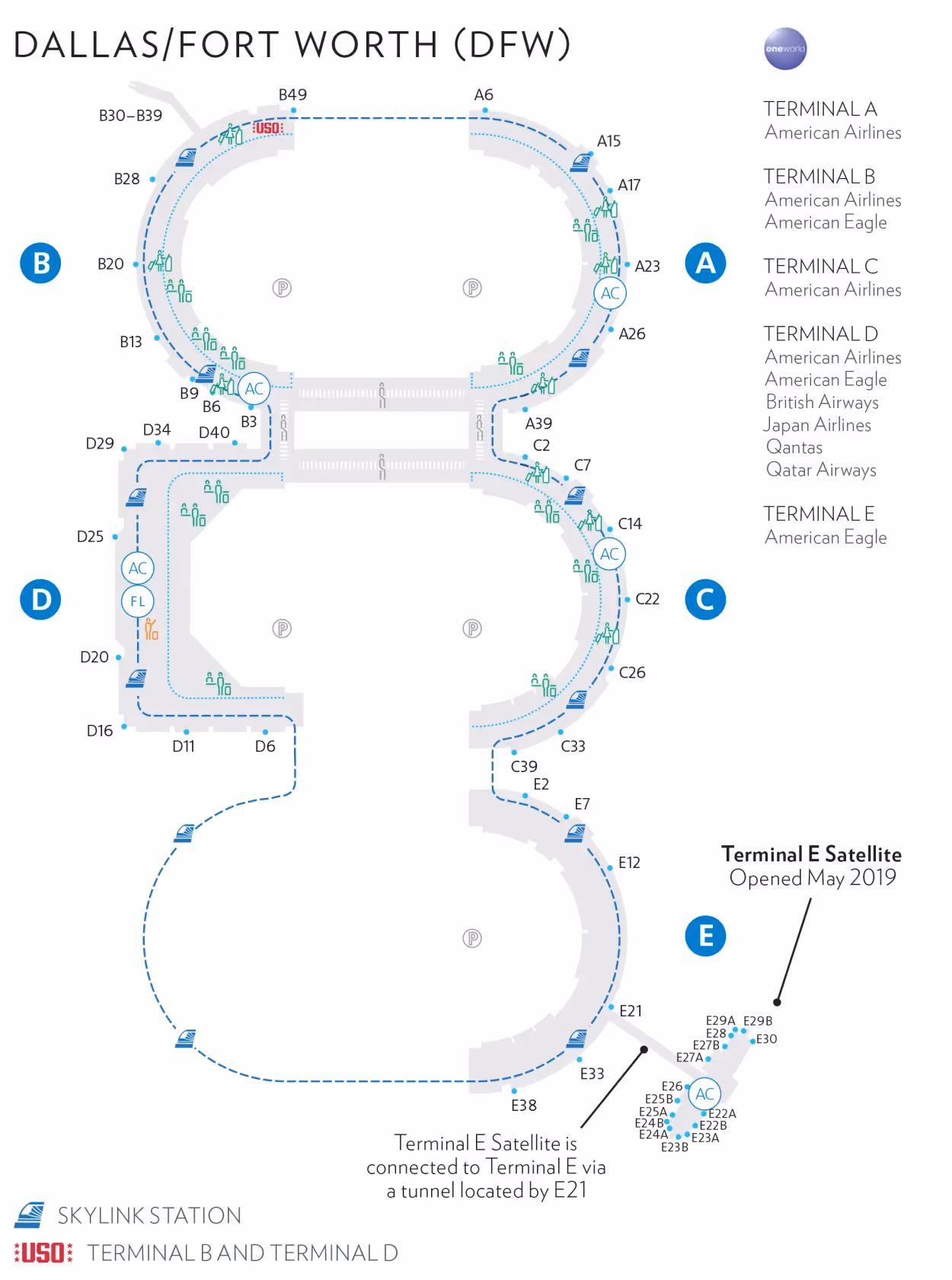American Airlines says that ongoing terminal investments at DFW include expansions of Terminals A and C and the future development of Terminal F, adding gates, premium lounges, customs facilities and modernized baggage systems.