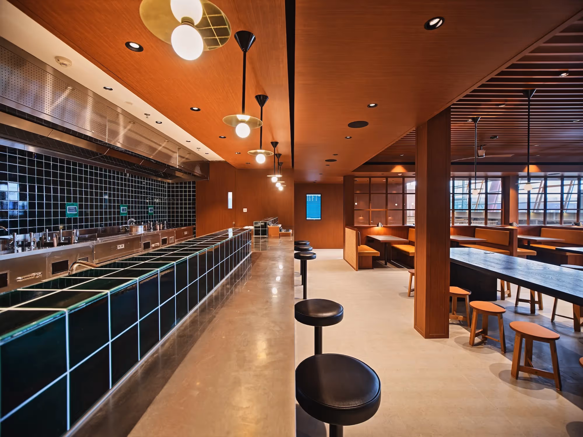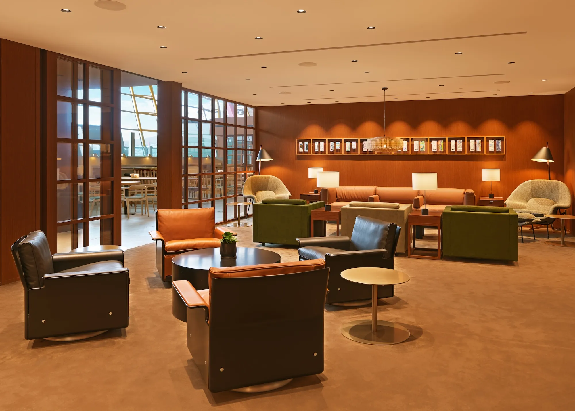According to the airline, the redesigned lounge is meant to feel less like a normal airport and more like a place where you can relax and spend some time. Oversized windows and well-placed roofing let in plenty of natural light, and cherry wood with limestone finishes adds a warm, welcoming touch.