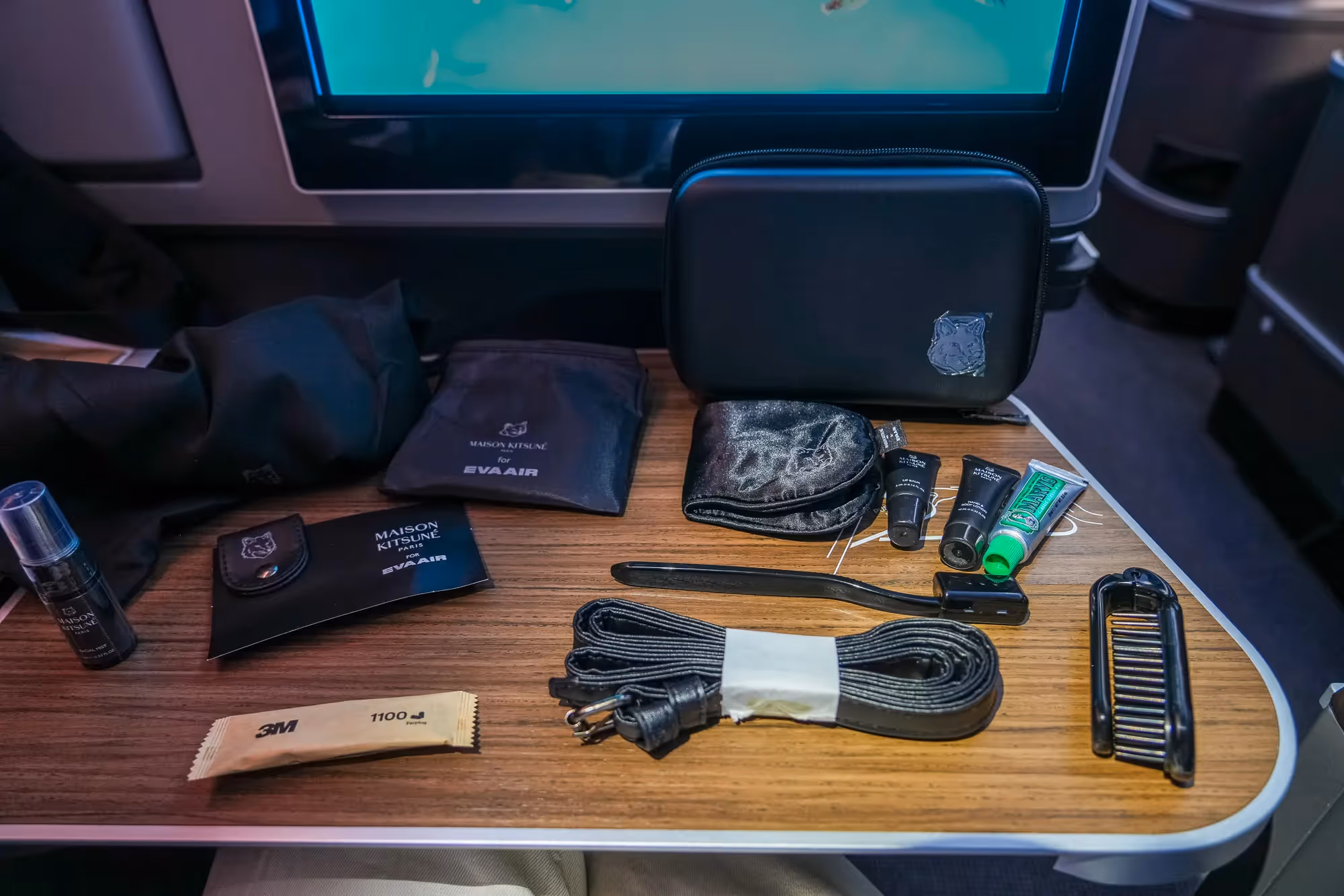 The new amenity kits and sleepwear are designed by Maison Kitsune, a French-Japanese lifestyle brand. The new kits were on display next to the buffet. BR will continue its tradition of offering two different versions of the amenity kit on inbound and outbound flights to/from TPE. The Premium Economy kits were also revamped with new colors.