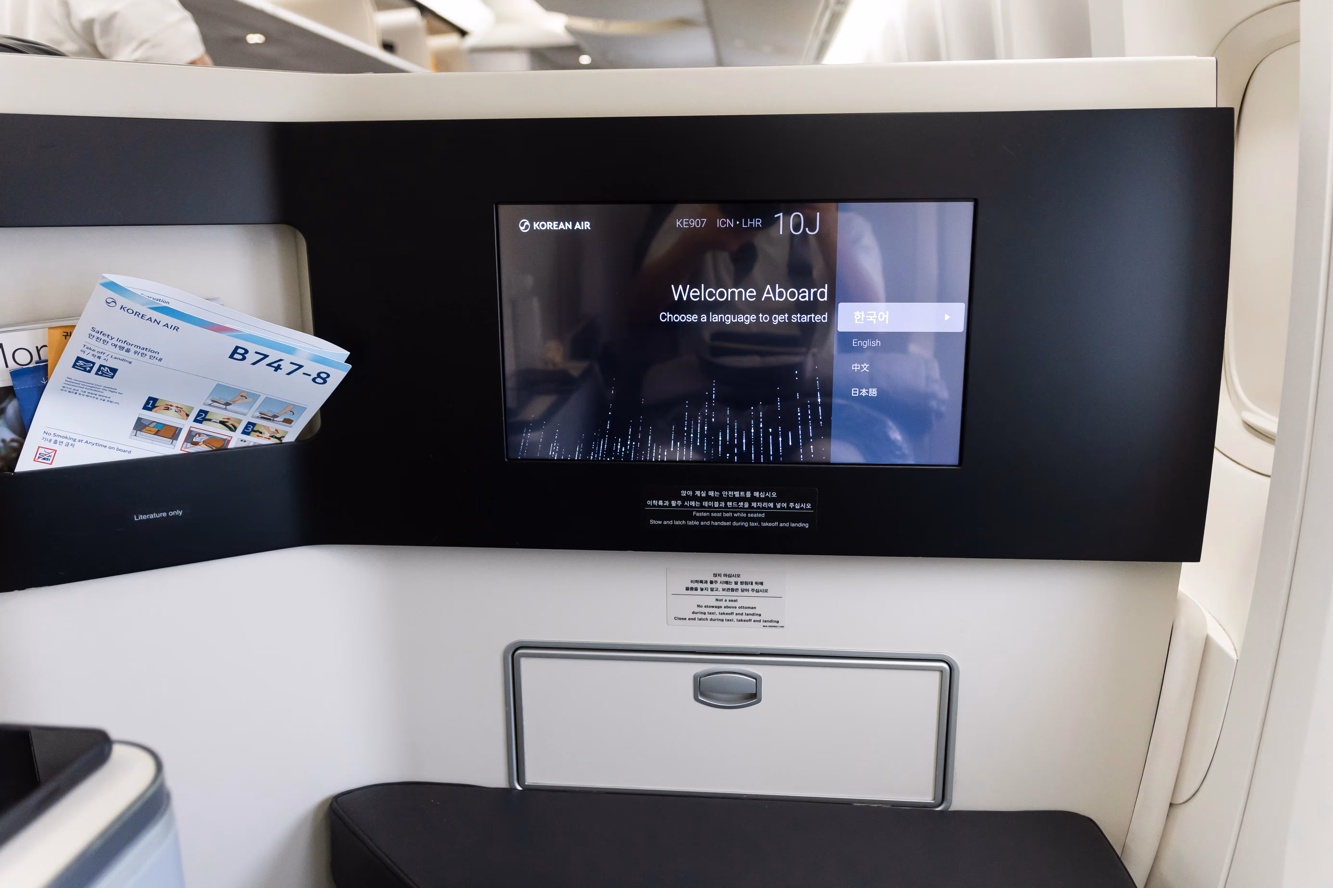 Welcome aboard KE 907 to London Heathrow, operated by an 8-year-old Boeing 747-8, registered HL7642. I have the pleasure of experiencing Korean Air’s Prestige Suite, seated in 10J on the lower deck, for the long 14-hour flight home.