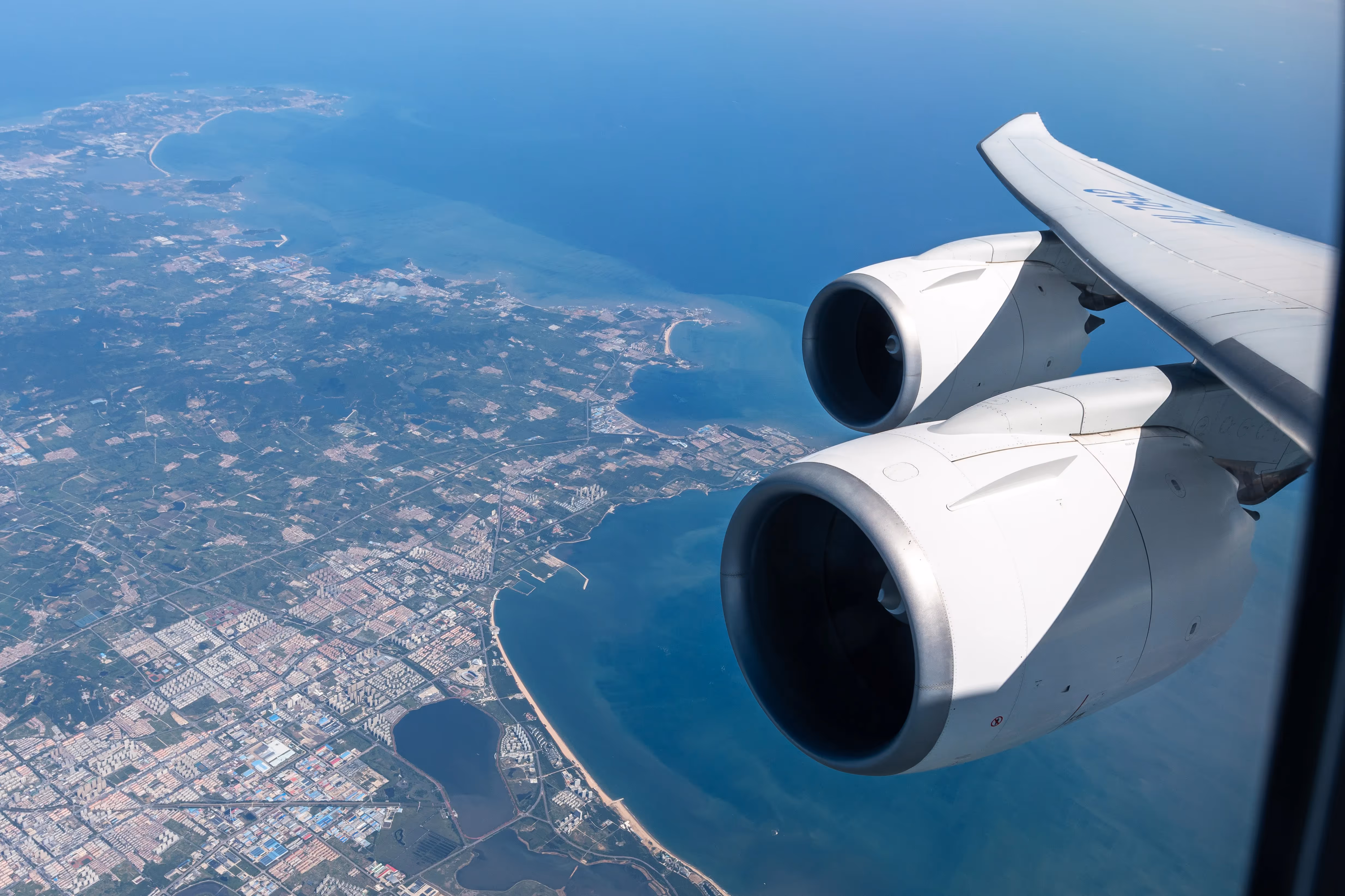 We headed into the low cloud base following an immediate left turn towards the west. The initial layer was thick, and we emerged a good few minutes later. As we reached China’s eastern coast, things cleared up nicely, and I took a few moments to appreciate the world below us.