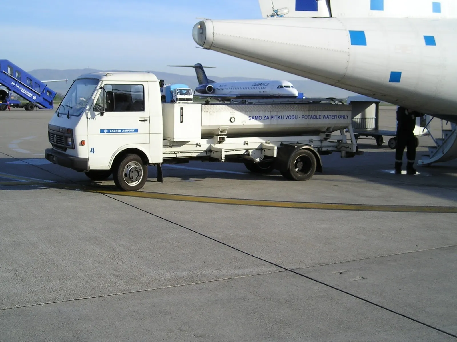 On the tarmac, specialized ground equipment and trained personnel handle the water uplift. The standard procedure is as follows: once the inbound flight has parked and is ready for turnaround, the water service truck (or cart) is driven up to the aircraft’s potable water service panel – usually located near the rear left or right fuselage, depending on the type. The truck is a pressurized tanker marked “Potable Water” (sometimes in the local language). Ground handlers connect a sanitized hose from the truck’s fill valve to the airplane’s fill port. A typical water cart might hold a few hundred liters (for regional jets), while a larger truck holds several thousand liters. For example, some towed carts are on the order of 1,000–3,000 L, and ramp trucks can exceed 5,000 L.