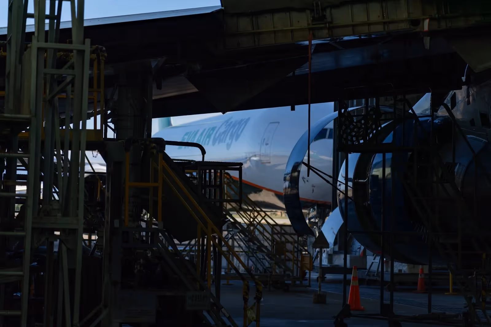 After we arrived from DFW, I noticed the large number of widebodies parked near the very beginning of RWY 05R. As we wore our safety equipment and entered the hangar, we immediately noticed twin-aisle airliners and double-decker freighters. We first met a white, unbranded Boeing 747-400F undergoing maintenance, then turned our heads to a British Airways (BA) Boeing 777-300ER.