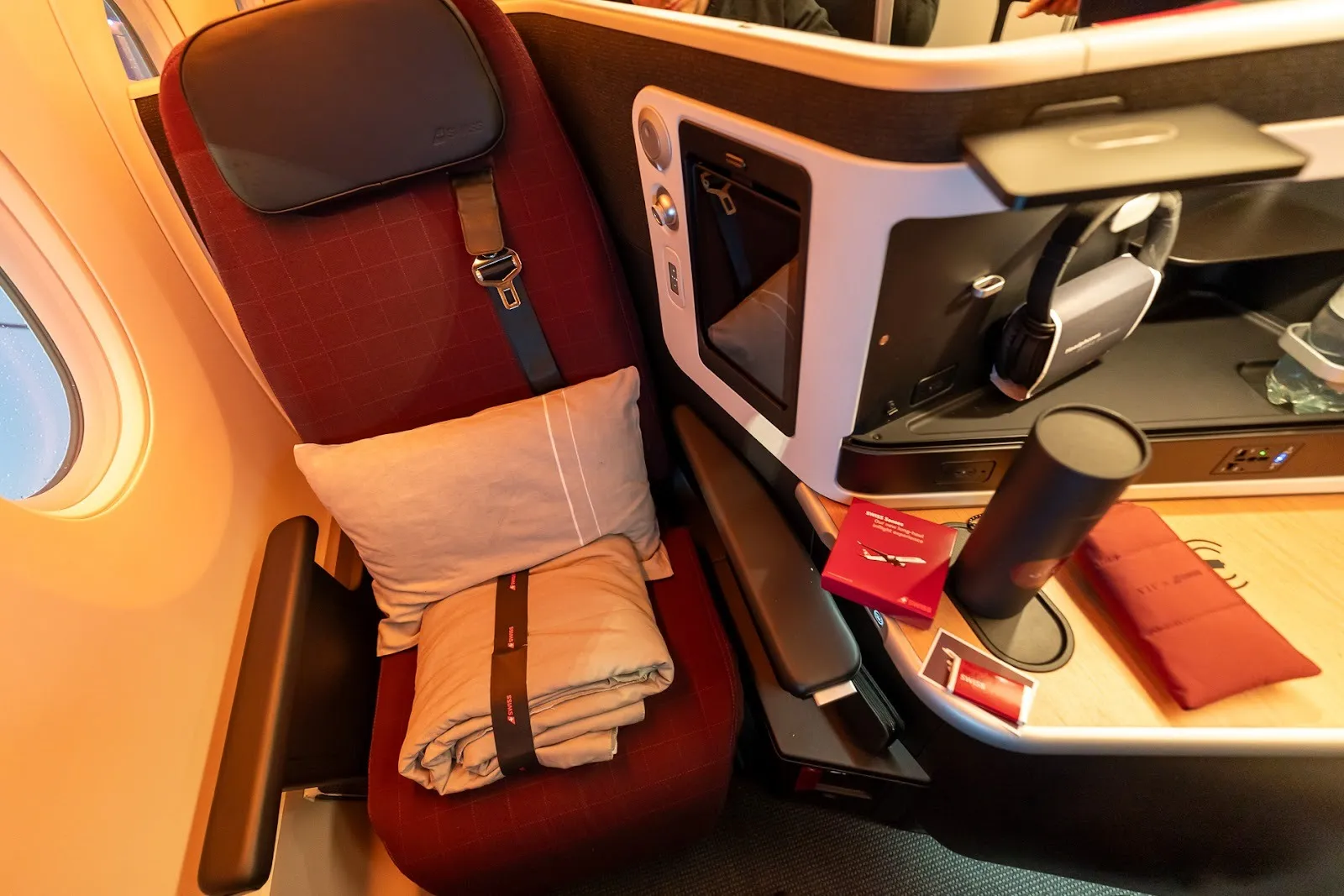 This may indeed be the Business Class seat with the most customization options in the industry at the moment. Next to the IFE controller, a dedicated air vent is found together with an adjustable reading light. More light points in the seat are displayed around the storage. As seat 9K is just behind the Business Suite, the legroom was outstanding. The seat also comes with a USB-A and USB-C charger, a universal power outlet, and an audio port for the provided headphones.