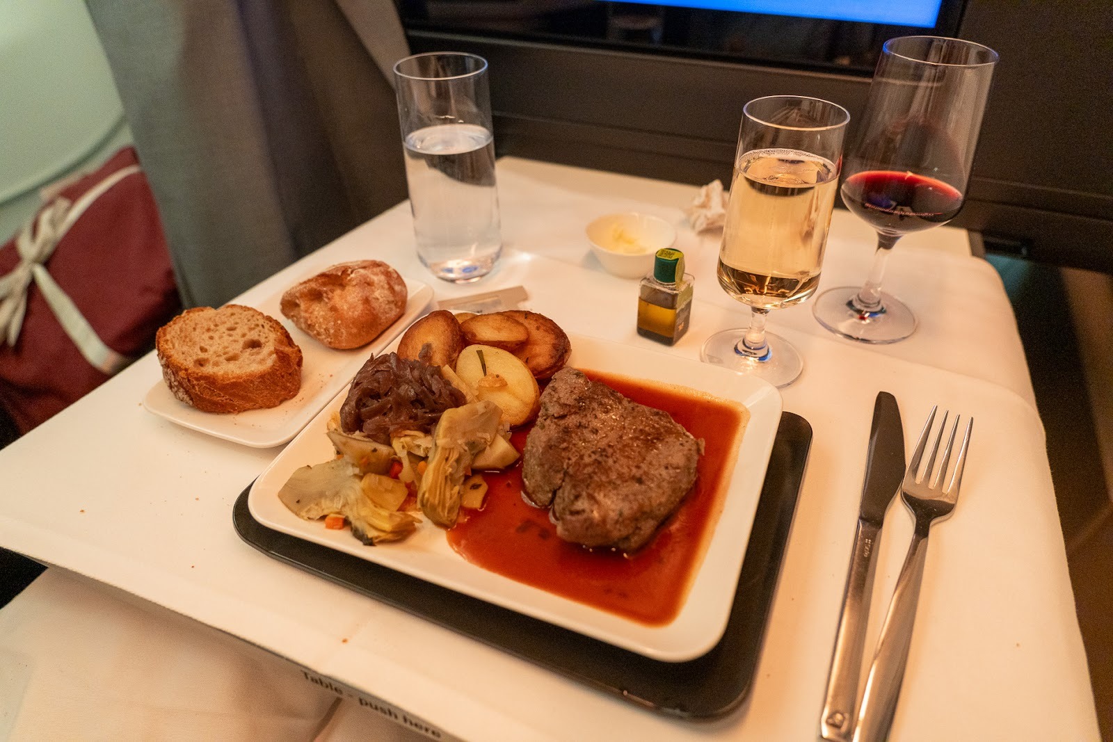 I enjoyed a glass of Jacquart Mosaique Brut champagne and a glass of Chateau La Garde 2016 before reclining my seat and checking out the new IFE selection and interface.