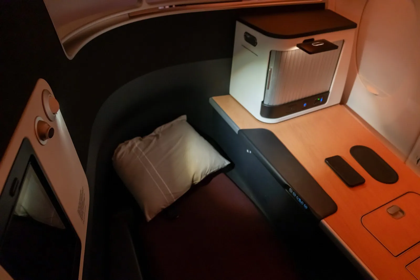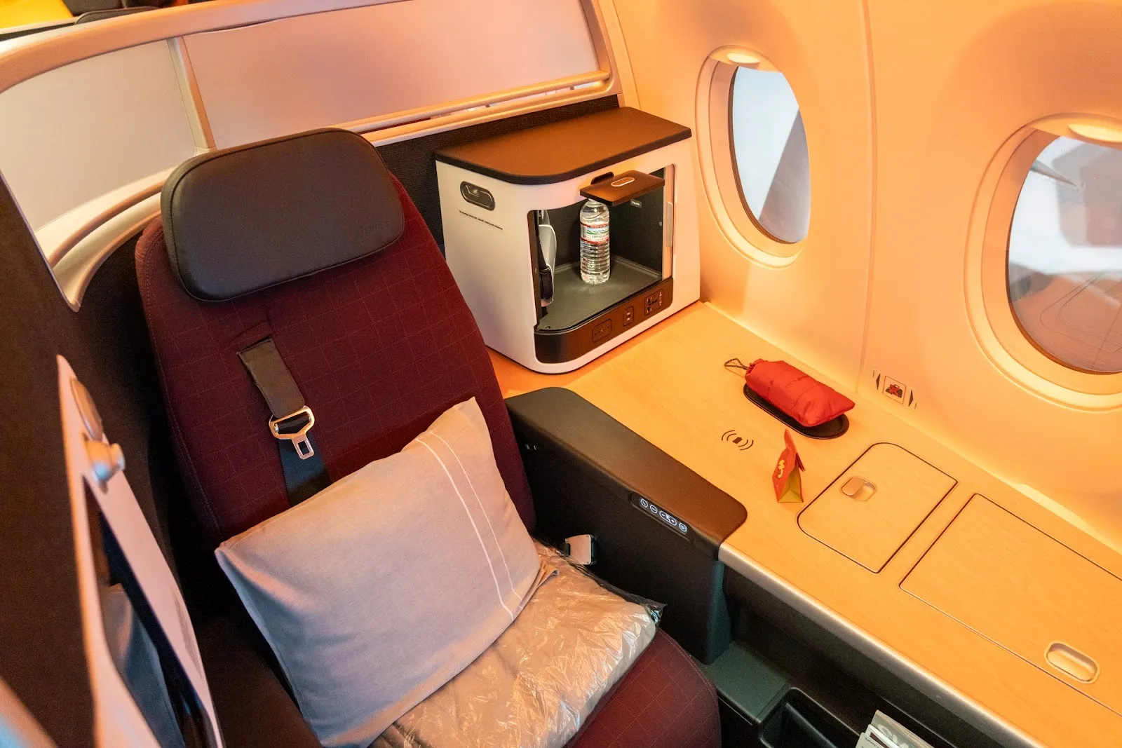 The seat’s benefits over the other four types are immediately noticeable. A large partition separates it from the rest of the cabin, providing greater privacy. Storage is paramount, with five large cabinets for everything from jackets to backpacks.