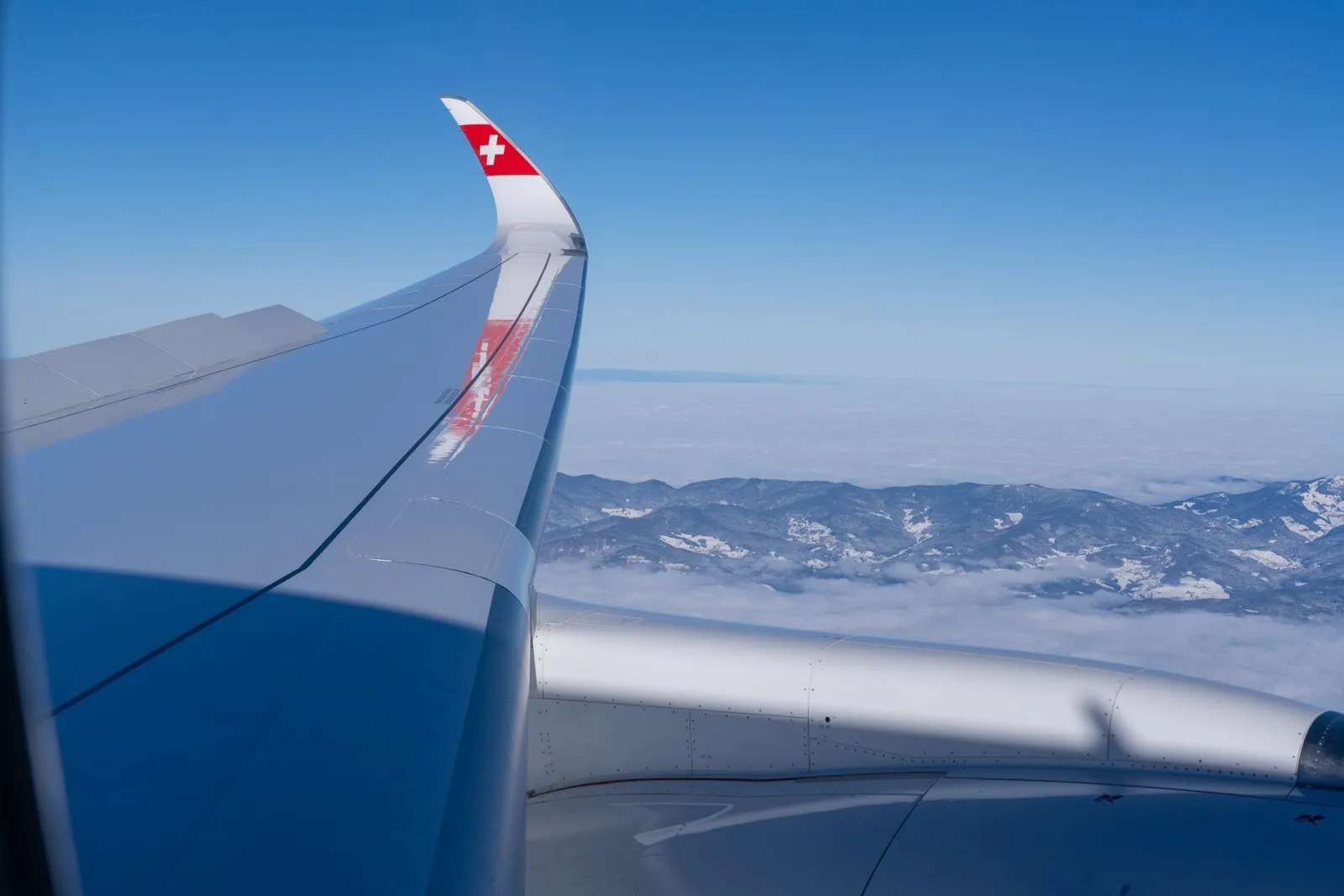 We cross the French capital, one of the few areas not covered in clouds, before descending into Zurich after a beautiful approach over snowy lands. We touched down on runway 14 and taxied to gate E67 past a line of LX widebodies.