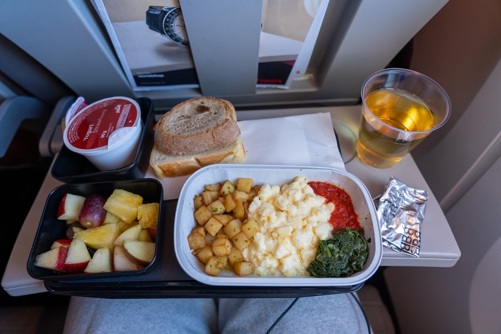 A few movies, naps and chats with the crew later, it was finally time to meet up with the sun. Breakfast was served about 2.5 hours before landing. Scrambled egg with Gruyere, diced potatoes with parsley, spinach, and tomatoes, served with bread, yoghurt, and fruit. A large, vegetarian selection, which I particularly enjoyed.